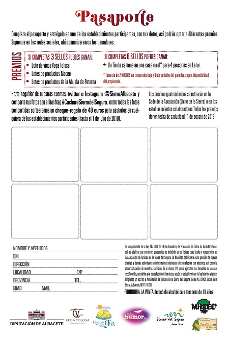 Los participantes en la 2º jornada de la cuchara en Ayna podrán conseguir premios, rellenando el pasaporte que encontrarán en los establecimientos adheridos y que deberán ir cuñando a medida que visiten bares o restaurantes participantes para degustar sus platos de cuchara.