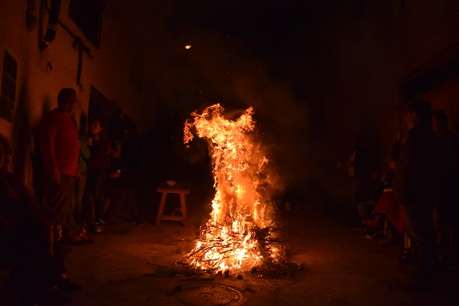 Las hogueras se encienden cuando comienza la noche. Como en cualquier punto de España, cualquier fiesta que se precie está basada en una buena gastronomía. Por eso, en estas hogueras son asados distintos productos, como patatas, chorizos, forro,… acompañados de buenos tragos de vino en el porrón o las primeras aceitunas de la cosecha que algún vecino ha preparado. Y, lo mejor, se disfuta todo esto compartido entre todos.